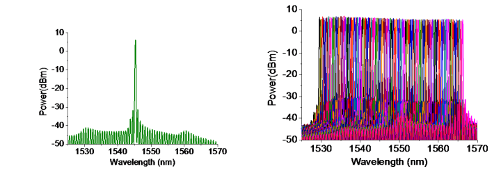 Example emission spectra of V-cavity tunable lasers (single-channel and full C-band 93 channels with 50GHz spacing)